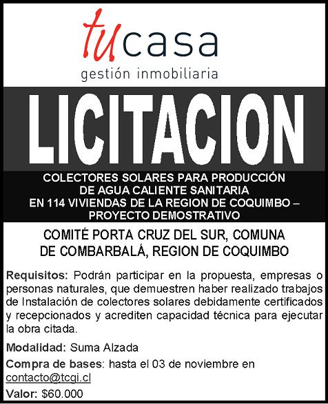 Tu casa Gestión Inmobiliaria Ltda.: Licitación Colectores Solares para Producción de Agua Caliente Sanitaria