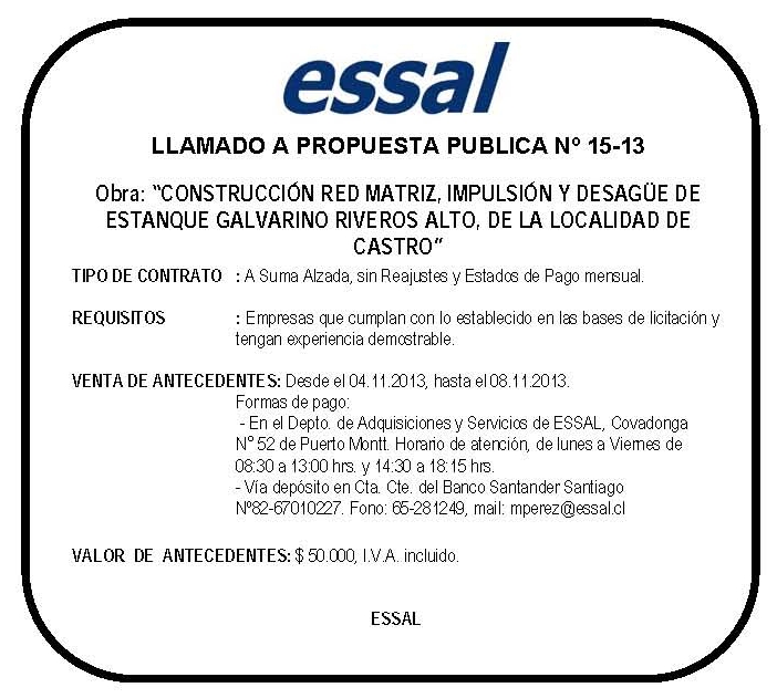 ESSAL: Propuesta Pública N° 15-13 Obra: “Construcción Red Matriz, Impulsión y Desagüe de Estanque Galvarino Riveros Alto, de la Localidad de Castro"