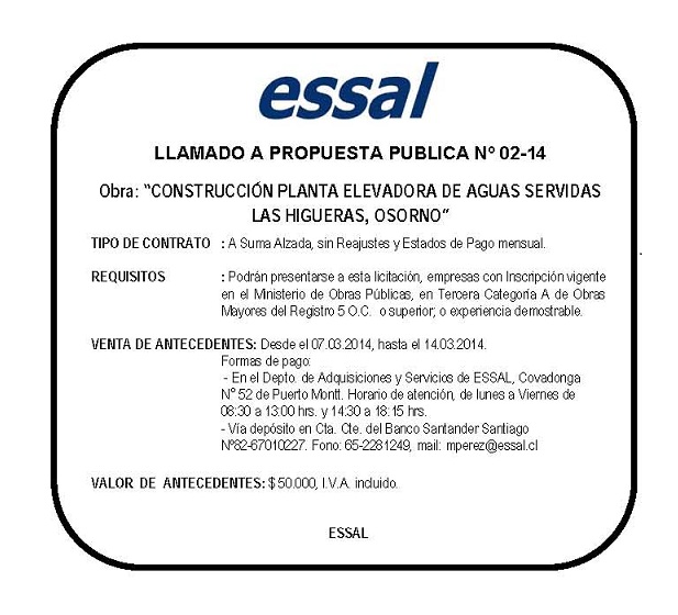 ESSAL S.A.: Propuesta Pública N° 02-14 Obra ”Construcción Planta Elevadora de Aguas Servidas Las Higueras, Osorno”