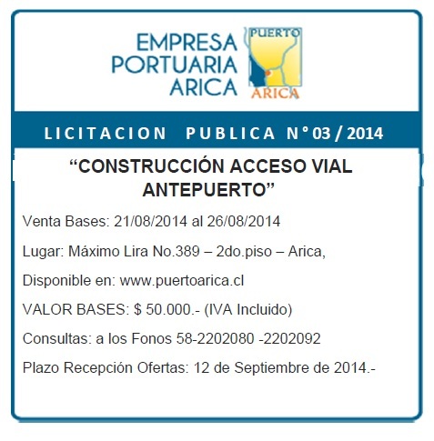 Empresa Portuaria Arica: Aviso Licitación Pública N° 03/2014 “Construcción Acceso Vial Antepuerto”