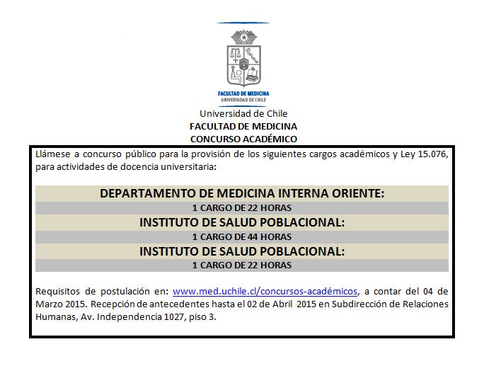 Universidad de Chile – Facultad de Medicina: Llama a Concurso Público para Proveer Cargos Académicos