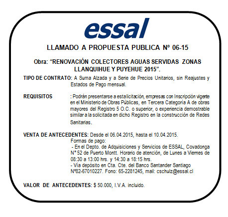 ESSAL S.A.: Llamado a Propuesta Pública N° 06-15 Obra “ Renovación Colectores Aguas Servidas Zonas Llanquihue y Puyehue 2015”
