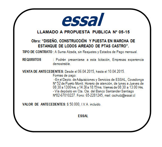 ESSAL S.A.: Llamado a Propuesta Pública N° 05-15 Obra “ Diseño, Construcción y Puesta en Marcha de Estanque de Lodos Aireado de Ptas Castro”