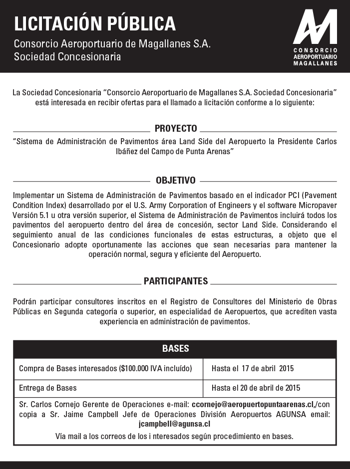 Consorcio Aeroportuario de Magallanes S.A. Soc. Concesionaria: Llamado a Licitación “ Sistema de Adm.de Pavimentos Área Land Side del Aeropuerto Presidente Carlos Ibañez del Campo de Punta Arenas