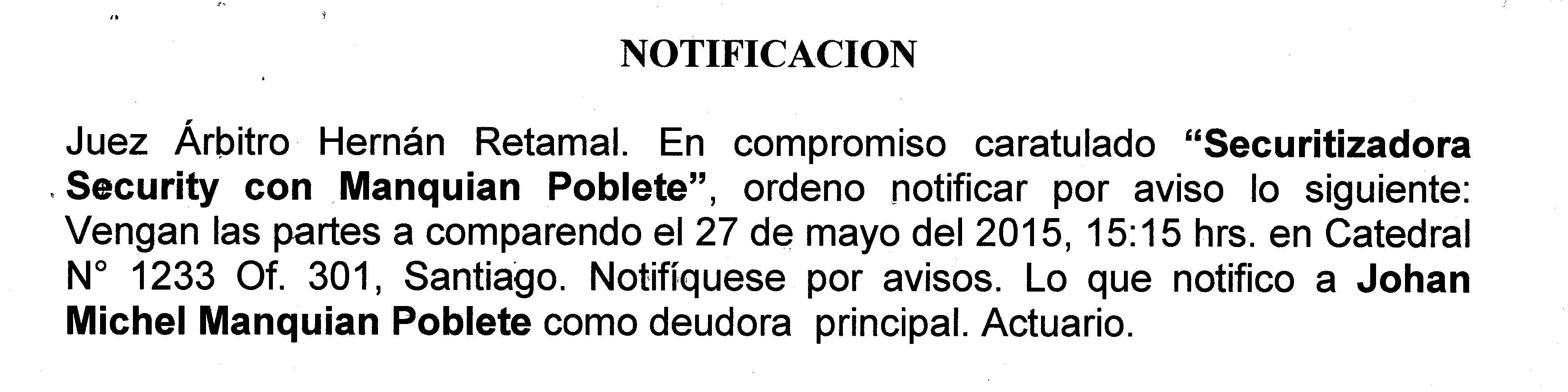 Notificación: Por Aviso a Johan Michel Manquian Poblete, Caratulado Securitizadora Security con Manquian Poblete