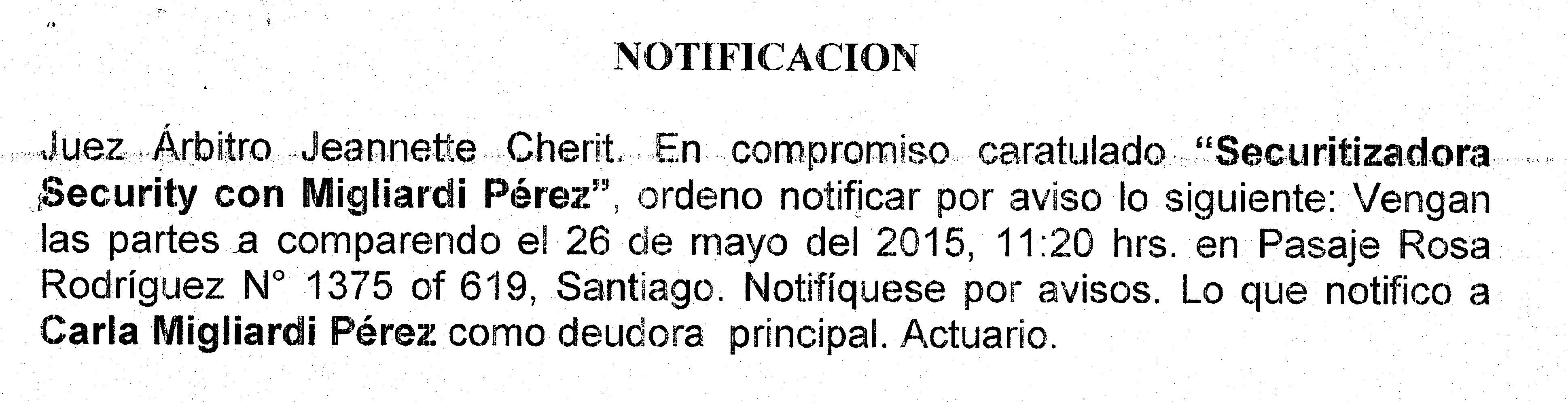 Notificación: Por Aviso a Carla Migliardi Pérez, Caratulado Securitizadora Security con Migliardi Pérez