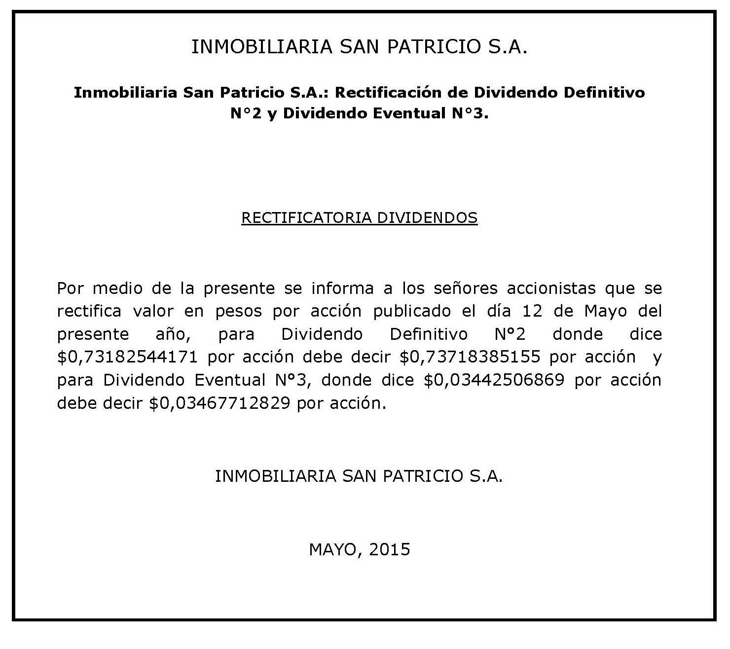 Inmobiliaria San Patricio S.A.: Rectificación de Dividendo Definitivo N°2 y Dividendo Eventual N°3