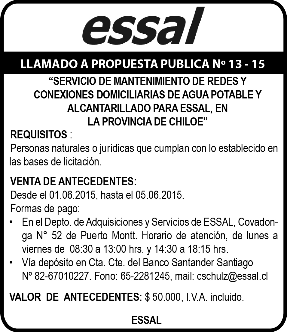 ESSAL S.A.: Propuesta Pública 13 – 15 Servicio de Mantenimiento de Redes y Conexiones Domiciliarias de Agua Potable y Alcantarillado en la Provincia de Chiloé