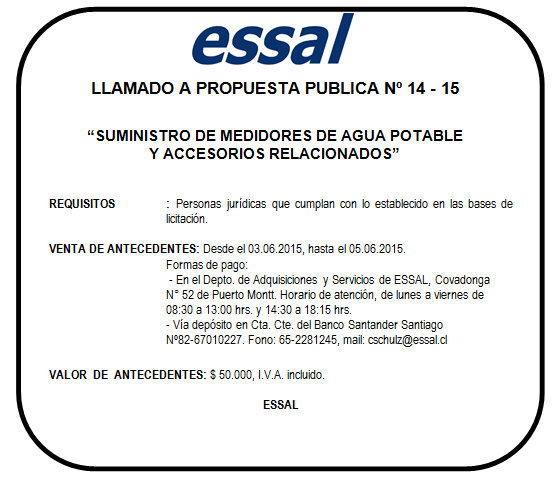 ESSAL S.A.: Llamado a Propuesta Pública N° 14-15 Suministro de Medidores de Agua Potable y Accesorios Relacionados