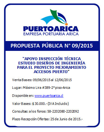 Empresa Portuaria Arica: Propuesta Pública N° 09/2015 “Apoyo Inspección Técnica Estudios Diseños de Ingeniería Proyecto Mejoramiento Accesos Puerto”