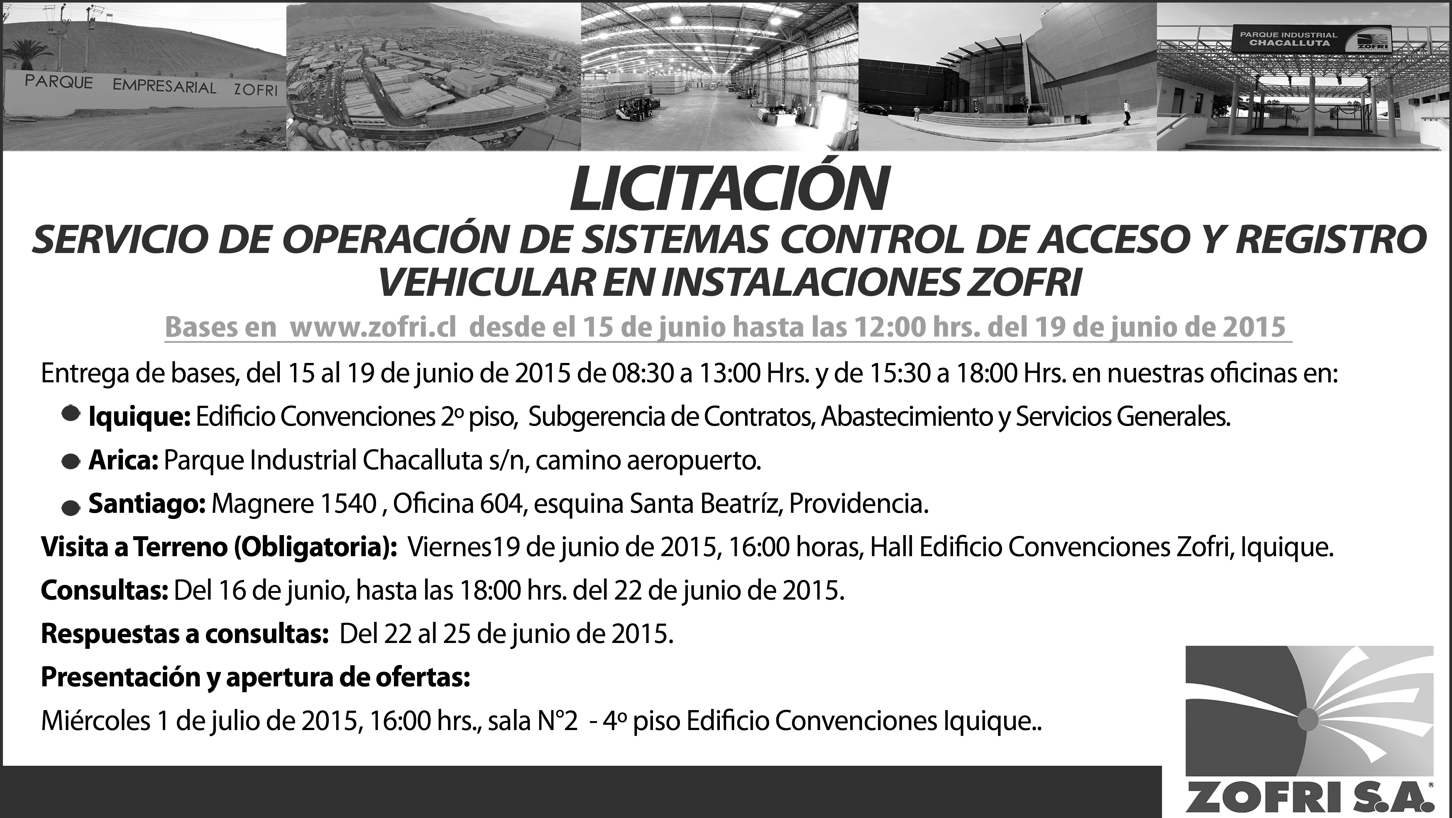 ZOFRI S.A. Licitación Servicio de Operación de Sistemas de Control de Acceso y Registro Vehicular en Instalaciones Zofri