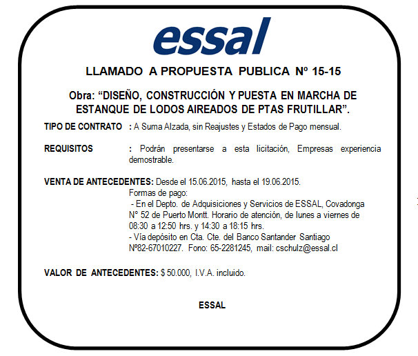 Essal S.A.: Licitación Pública N°15-15 Diseño, Construcción y Puesta en Marcha de Estanque de Lodos Aireados de PTAS Frutillar