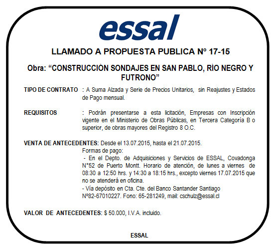 ESSAL S.A.: LLamado a Propuesta Pública N°17-15 Obra”Construcción Sondajes en San Pablo, Río Negro y Futrono”