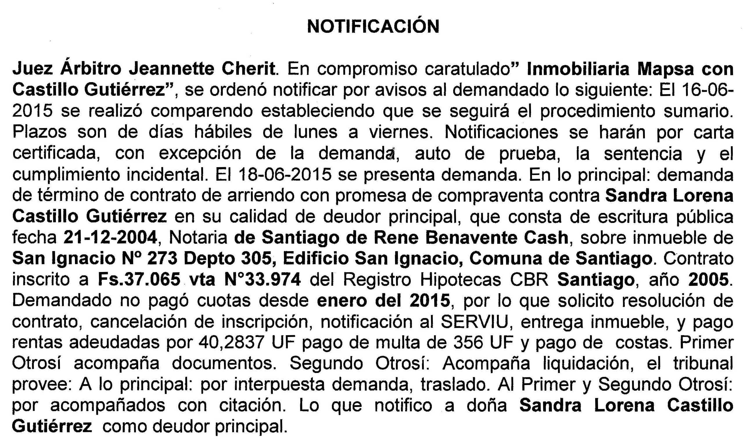 Notificación: Por Avisos a Sandra Lorena Castillo Gutiérrez, Caratulado Inmobiliaria Mapsa con Castillo Gutiérrez