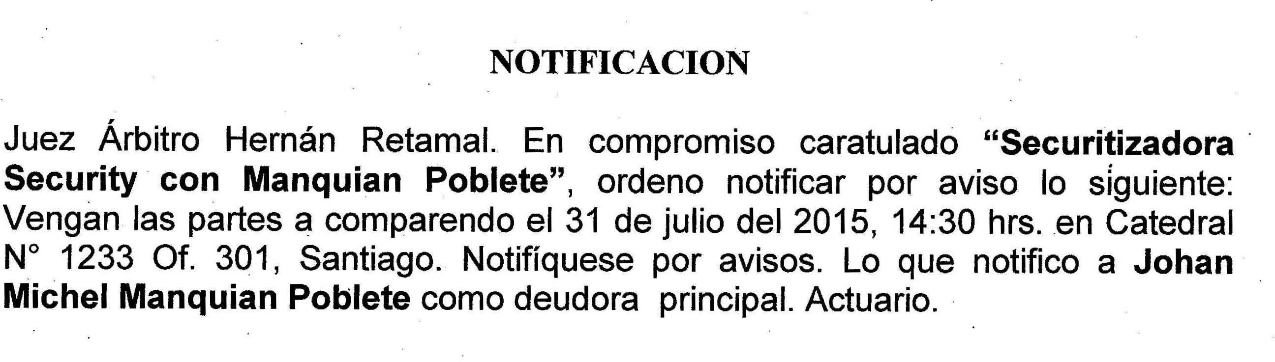 Notificación: Por Avisos a Johan Michel Manquian Poblete, Caratulado Securitizadora Security con Manquian Poblete