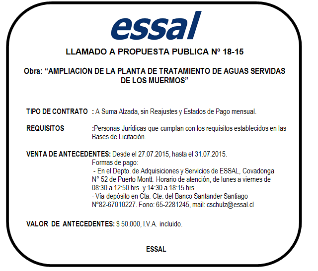 ESSAL S.A.: Llamado a Propuesta Pública N°18-15 Obra: ”Ampliación de la Planta de Tratamiento de Aguas Servidas de Los Muermos”