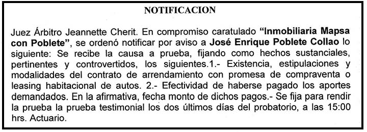 Notificación por Aviso a José Enrique Poblete Collao, Compromiso Caratulado "Inmobiliaria Mapsa con Poblete" Causa de Prueba.