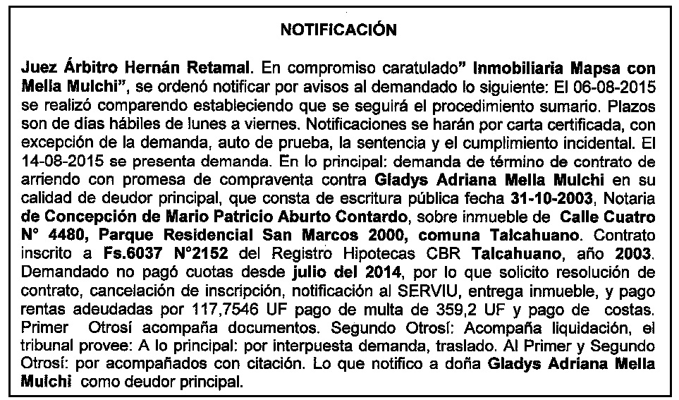 Notificación por Aviso a Gladys Adriana Mella Mulchi, Compromiso Caratulado "Inmobiliaria Mapsa con Mella Mulchi".