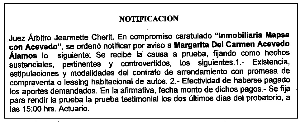 Notificación por Aviso a Margarita del Carmen Acevedo Álamos, Compromiso Caratulado "Inmobiliaria Mapsa con Acevedo" Causa de Prueba.