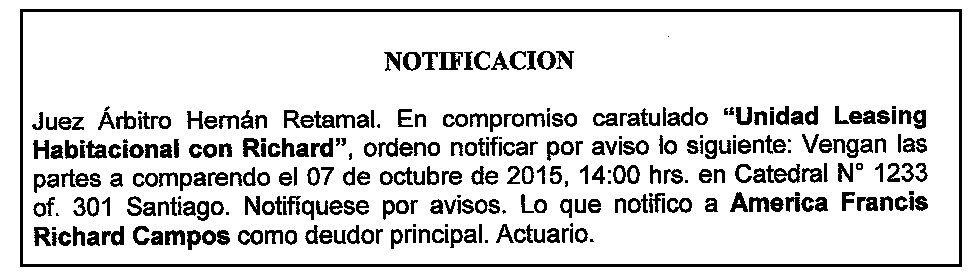 Notificación por Aviso a America Francis Richard Campos, Compromiso Caratulado "Unidad Leasing Habitacional con Richard".