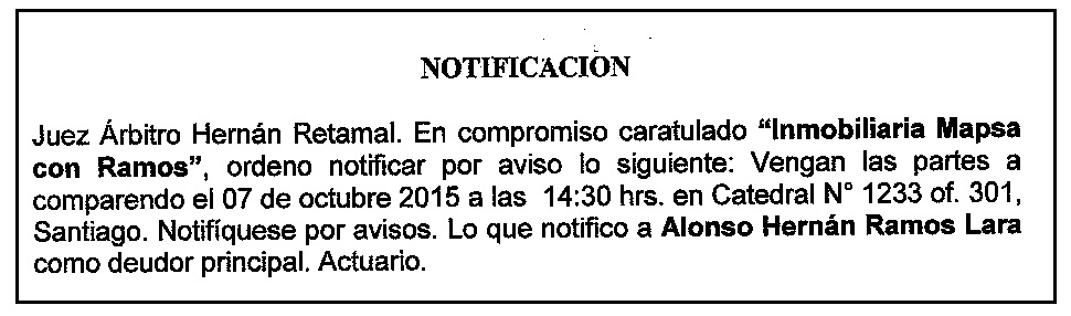 Notificación por Aviso a Alonso Hernán Ramos Lara, Compromiso Caratulado "Inmobiliaria Mapsa con Ramos".