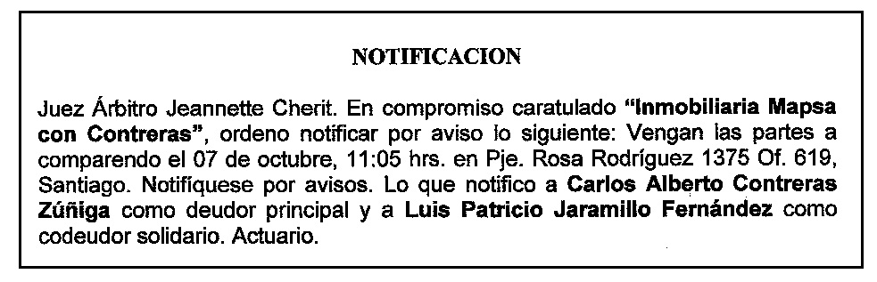 Notificación por Aviso a Carlos Alberto Contreras Zúñiga, Compromiso Caratulado "Inmobiliaria Mapsa con Contreras".