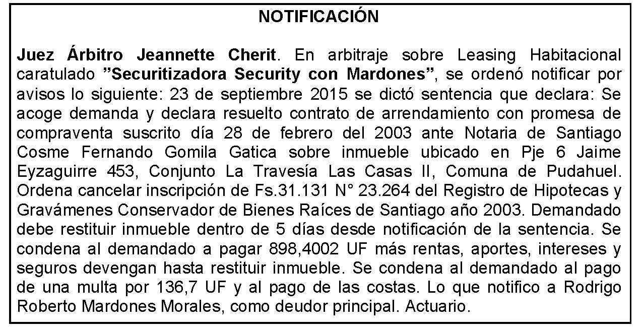 Notificación por Aviso a Rodrigo Roberto Mardones Morales, Compromiso Caratulado "Securitizadora Security con Mardones"
