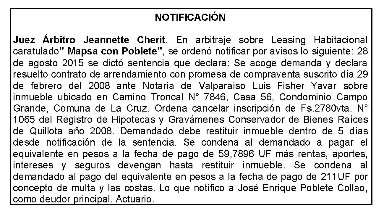 Notificación por Aviso a José Enrique Poblete Collao, Compromiso Caratulado "Inmobiliaria Mapsa con Poblete"