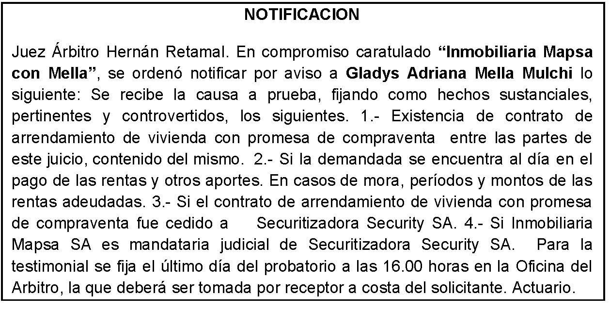 Notificación por Aviso a Gladys Adriana Mella Mulchi, Compromiso Caratulado "Inmobiliaria Mapsa con Mella Mulchi" Causa a Prueba.