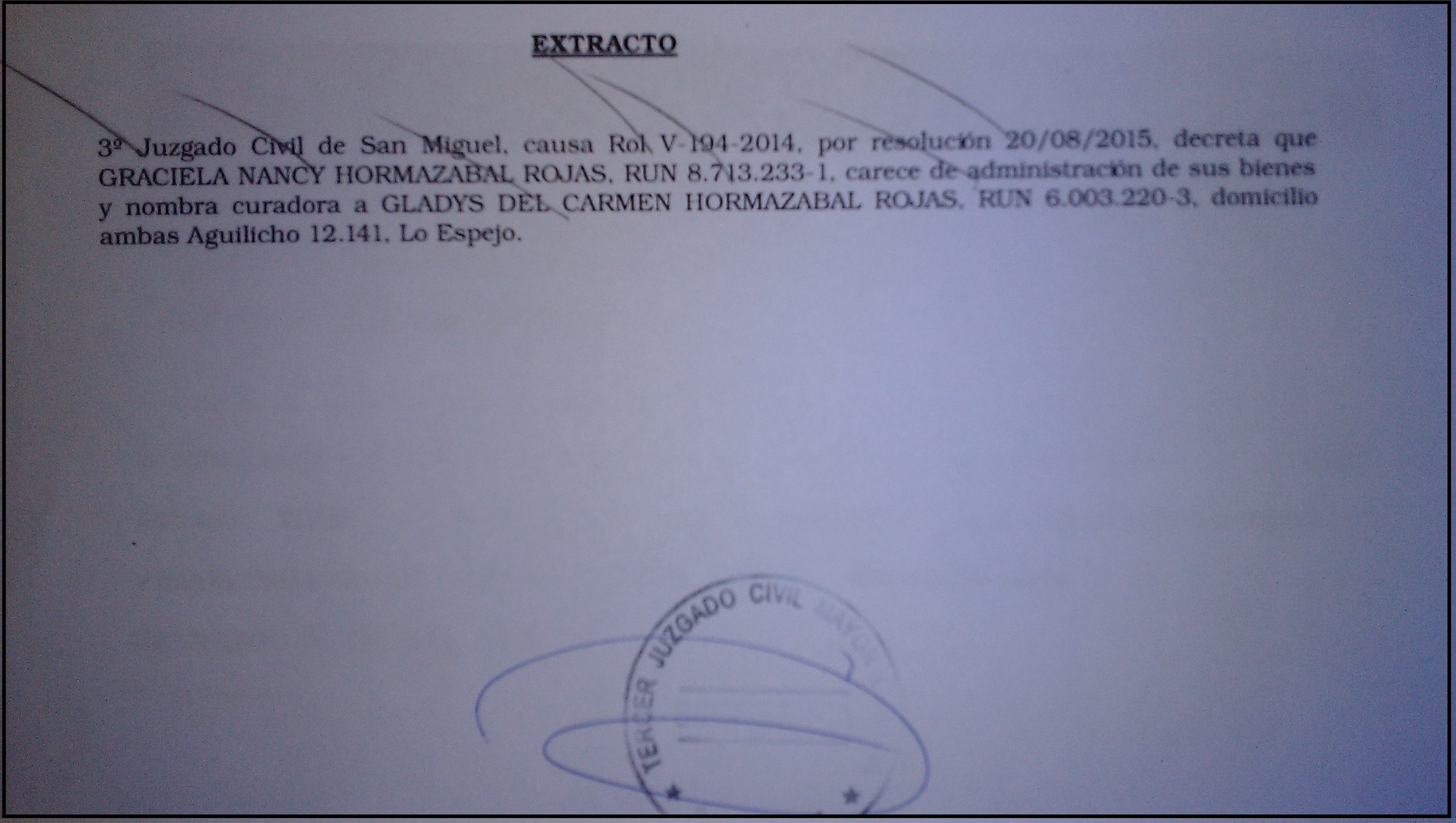 Extracto: Por Resolución se decreta en Causa Rol V-194-2014, ante el 3° Juzgado Civil de San Miguel, lo siguiente: