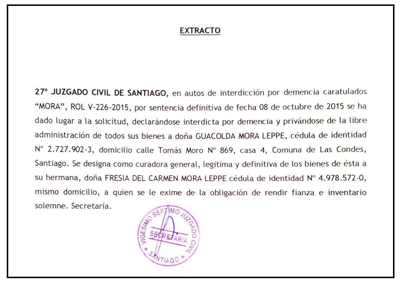 Extracto de Interdicción por Demencia de doña Guacolda Mora Leppe Caratulado “ Mora”, Rol V-226-2015 ante el 27° Juzgado Civil de Santiago
