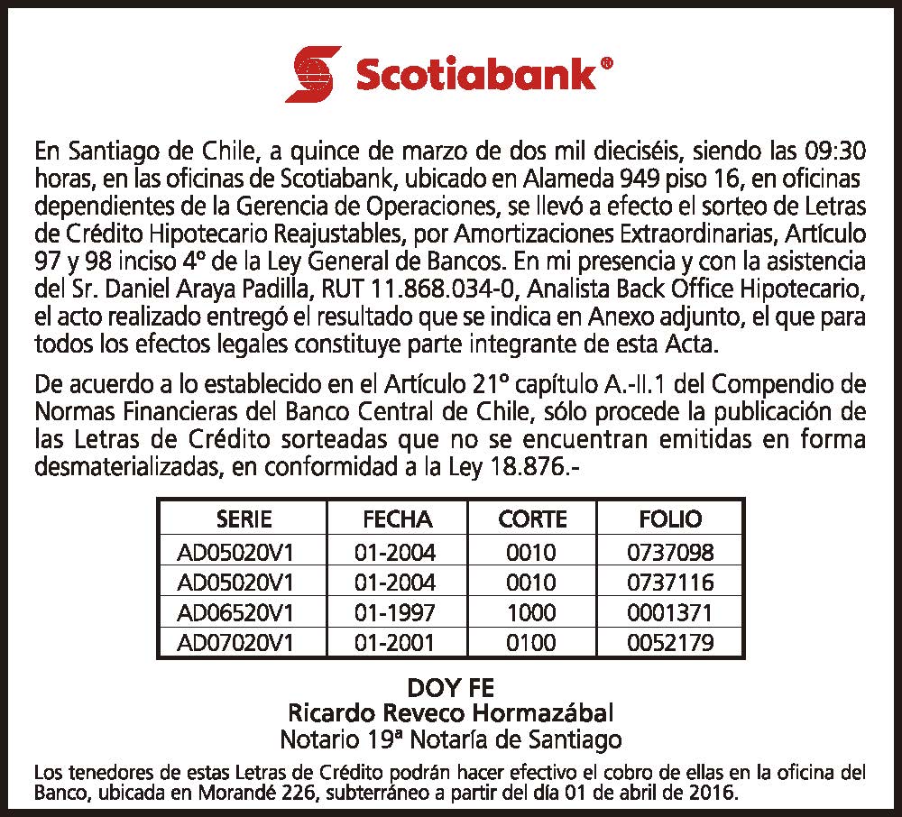 SCOTIABANK: Sorteo de Letras Hipotecarias Marzo de 2016