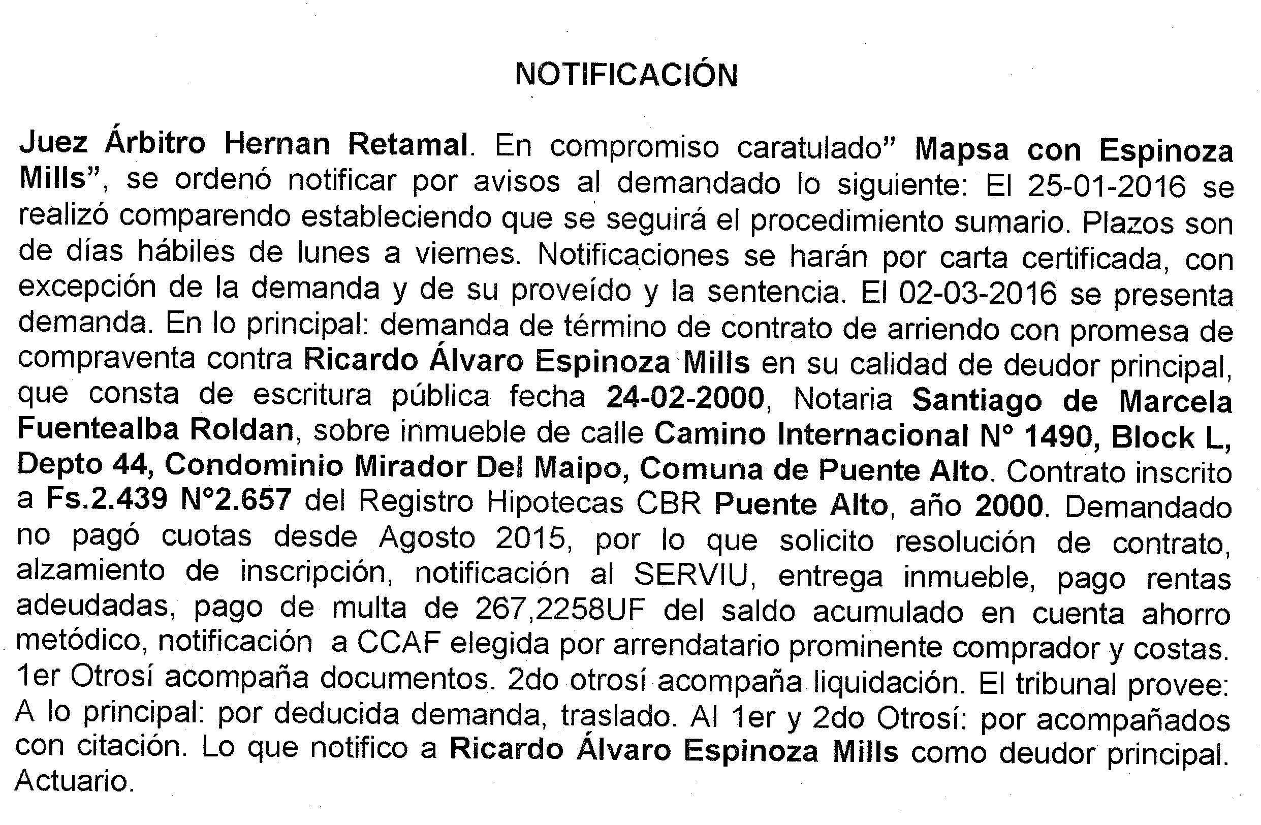 Notificación por Aviso a Ricardo Alvaro Espinoza Mills, Compromiso Caratulado "Inmobiliaria Mapsa con Espinoza Mills" Demanda Término de Contrato.