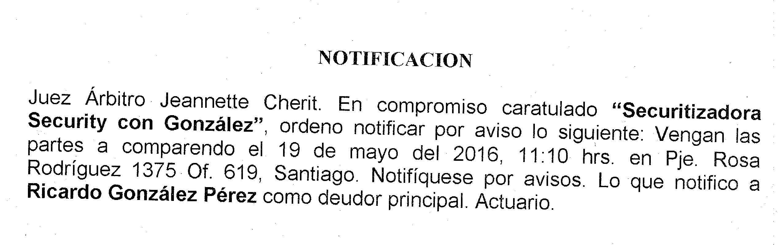 Notificación por Aviso a Ricardo González Pérez, Compromiso Caratulado "Securitizadora Security con González"
