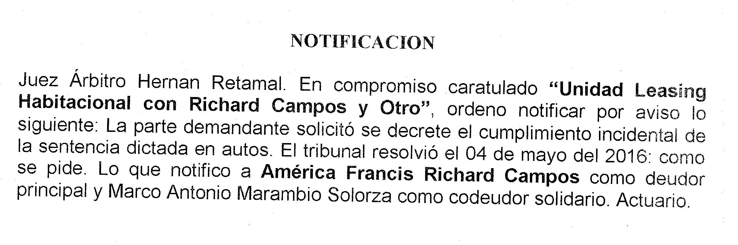 Notificación por Aviso a América Francis Richard Campos, Compromiso Caratulado "Unidad Leasing Habitacional con Richard Campos y Otro"