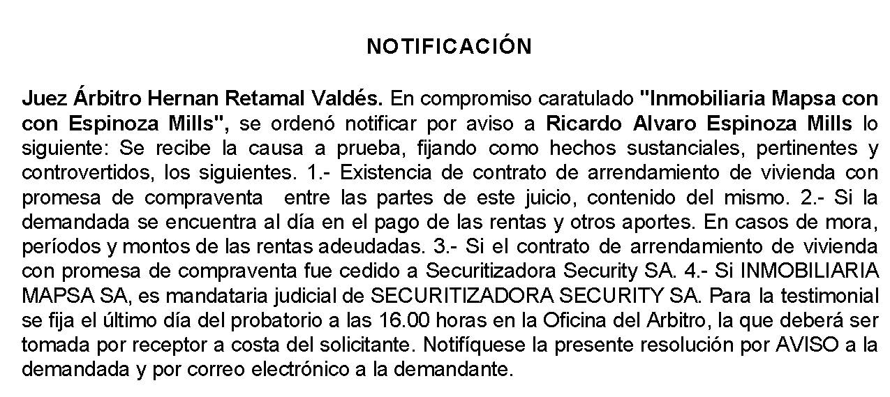 Notificación por Aviso a Ricardo Alvaro Espinoza Mills, Compromiso Caratulado "Inmobiliaria Mapsa con Espinoza Mills"
