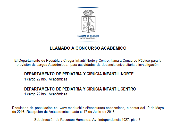UNIVERSIDAD DE CHILE – FACULTAD DE MEDICINA: Llamado a Concurso Académico para Provisión de Cargos para el Departamento de Pediatría y Cirugía Infantil Norte y Centro.