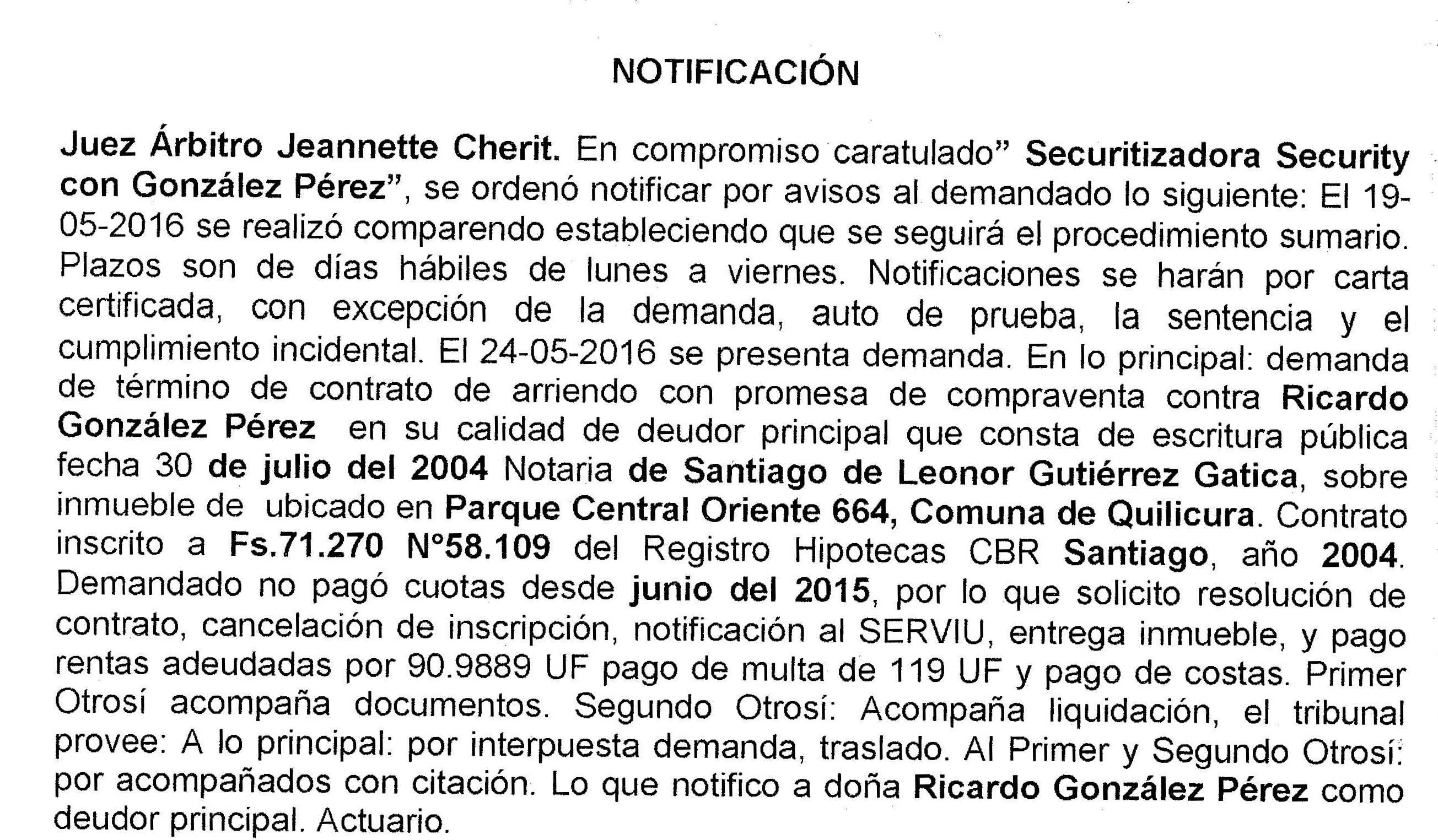 Notificación por Aviso a Ricardo González Pérez, Compromiso Caratulado "Securitizadora Security con González Pérez"