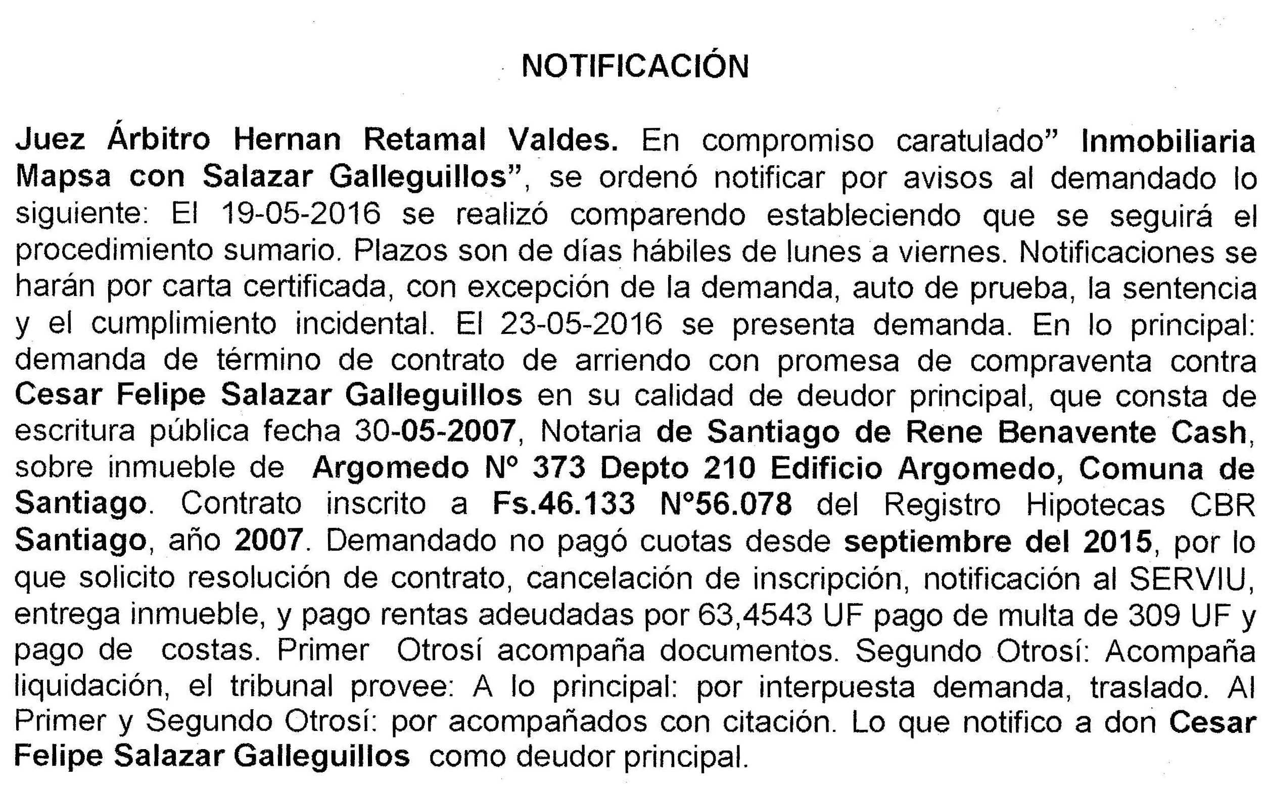 Notificación por Aviso a Cesar Felipe Salazar Galleguillos, Compromiso Caratulado "Inmobiliaria Mapsa con Salazar Galleguillos" Demanda.
