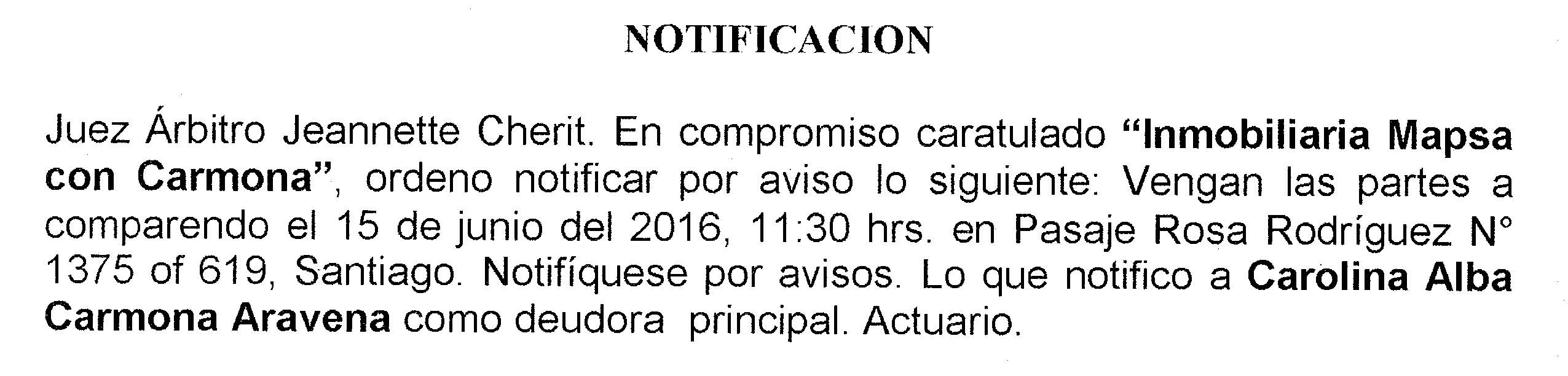 Notificación por Aviso a Carolina Alba Carmona Aravena, Compromiso Caratulado "Inmobiliaria Mapsa con Carmona"