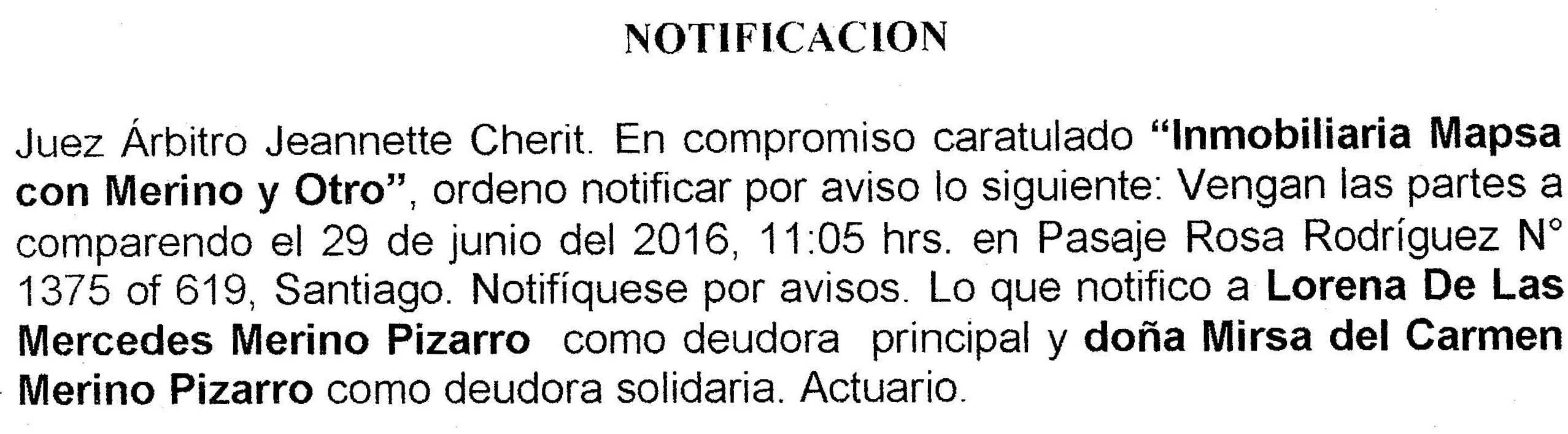 Notificación por Aviso a Lorena de las Mercedes Merino Pizarro, Compromiso Caratulado "Inmobiliaria Mapsa con Merino y Otro"