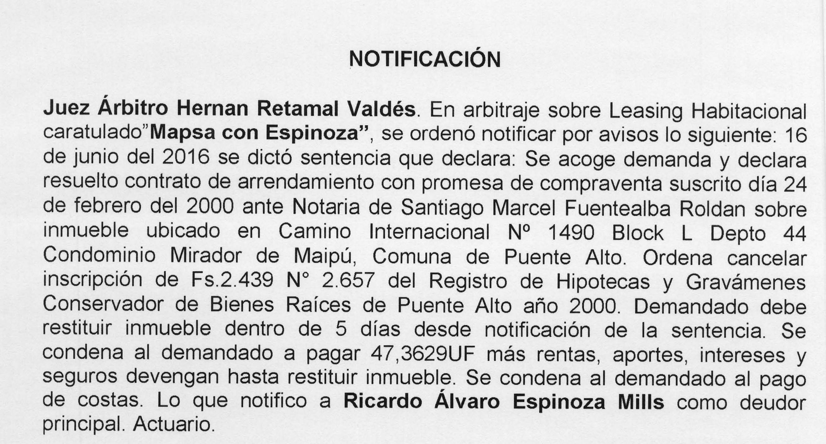 Notificación por Aviso a Ricardo Álvaro Espinoza Mills, Compromiso Caratulado "Inmobiliaria Mapsa con Espinoza" Fallo.