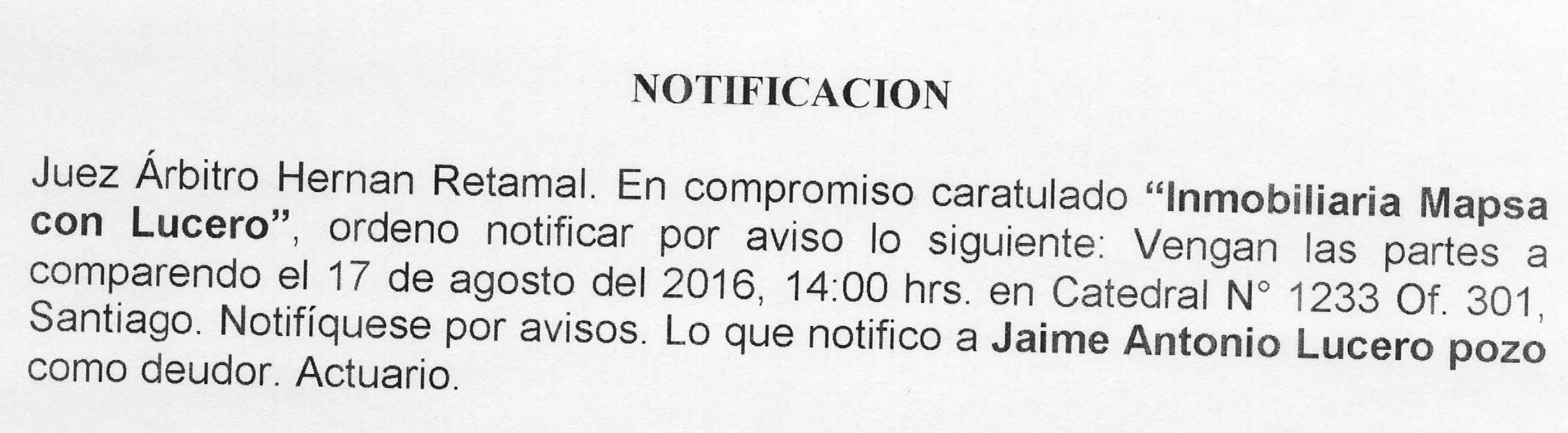 Notificación por Aviso a Jaime Antonio Lucero Pozo, Compromiso Caratulado "Inmobiliaria Mapsa con Lucero" Comparendo.