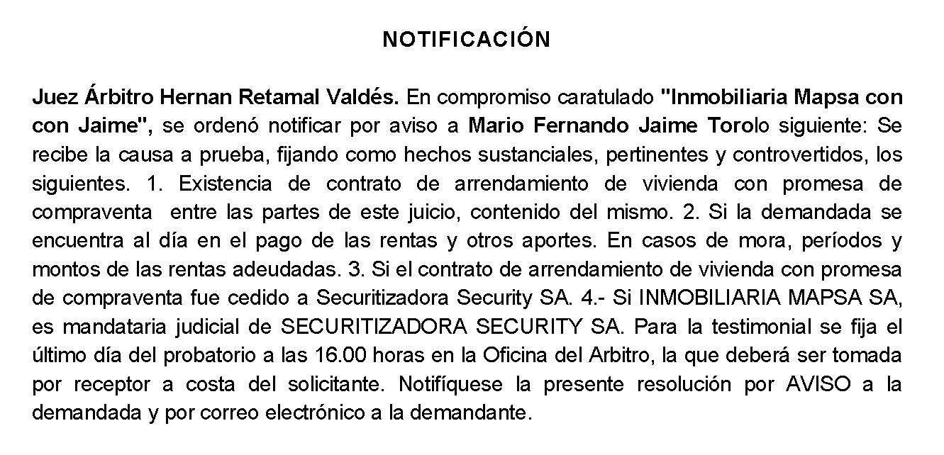 Notificación por Aviso a Mario Fernando Jaime Toro, Compromiso Caratulado "Inmobiliaria Mapsa con Jaime" Causa de Prueba.