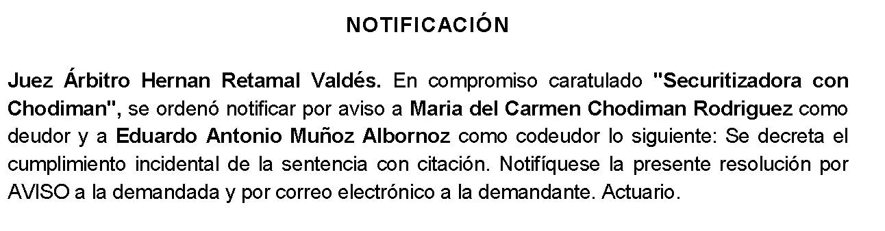 Notificación por Aviso a María del Carmen Chodiman Rodríguez, Compromiso Caratulado "Securitizadora Security con Chodiman" Cumplimiento.