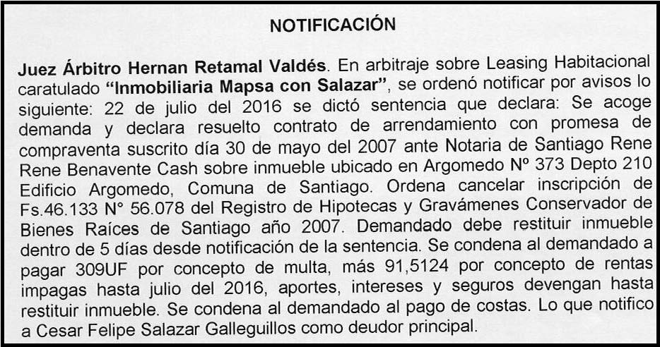 Juez Arbitro Hernan Retamal Valdés. En autos caratulados “ Inmobiliaria Mapsa con Salazar”. Ha ordenado notificar que se dictó sentencia, lo siguiente:
