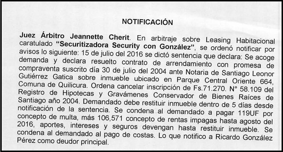 Juez Arbitro Jeannette Cherit. En autos caratulados “ Securitizadora Security con González”. Ha ordenado notificar que se dictó sentencia, lo siguiente: