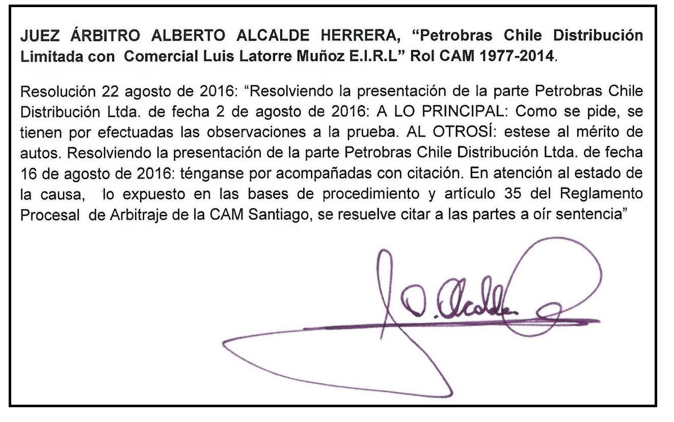 JUEZ ARBITRO ALBERTO ALCALDE H. “Petrobras Chile Distribución Limitada con Comercial Luis Latorre Muñoz E.I.R.L.” Rol CAM 1977-2014.: Resolución