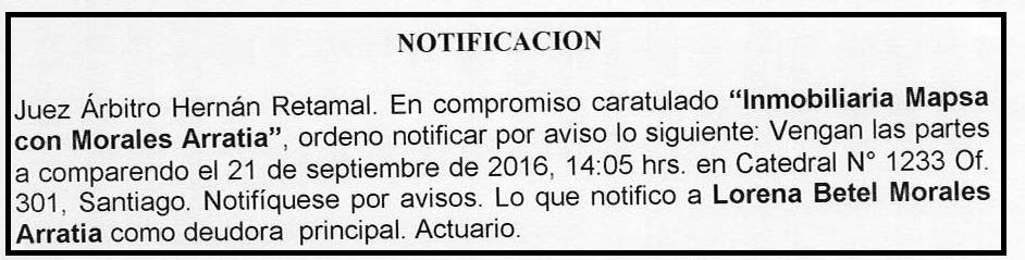 Notificación por Aviso a Lorena Betel Morales Arratia, Compromiso Caratulado "Inmobiliaria Mapsa con Morales Arratia"