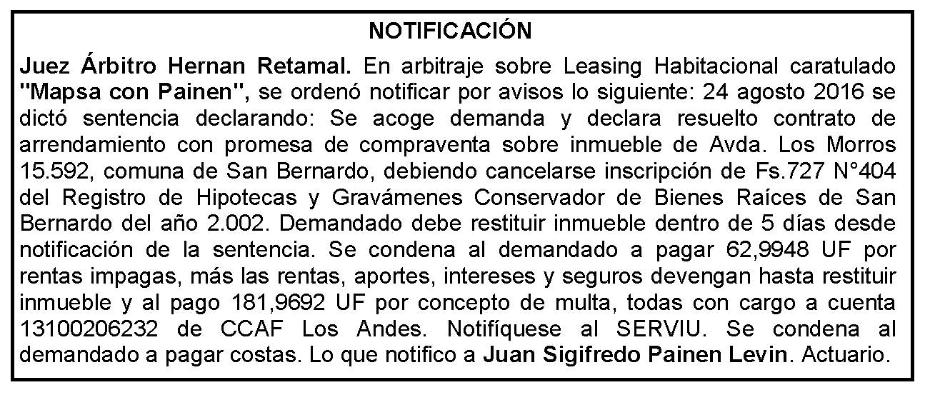 Notificación por Aviso a Juan Sigifredo Painen Levin, Compromiso Caratulado "Inmobiliaria Mapsa con Painen" Sentencia.